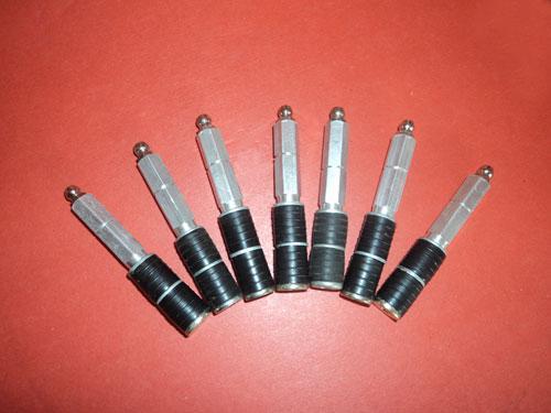 高压堵漏针头:是利用环压紧固的原理。头部设有单向截止阀,可防止浆液在高压推挤下倒喷。环压膨胀部分用橡胶套管,直径为13MM,塞入孔径为14MM的注浆孔上,拧紧环压螺栓,压缩橡胶套管,使注浆嘴固定在注浆孔内。(注浆嘴的单向阀要在0。4KN以上压力才能打开,因此注浆压力必须高于这个数值)。高压止水针头目前共有四种类型:铜嘴、铝嘴、钢嘴、 塑料嘴 , 前三种为环压式。 分为前止水型,即灌浆嘴进料口的逆止阀门设在 进口处;后止水型, 即进料口的逆止阀门设在出口处 ,可视具体情况进行选择。前止水型埋设好嘴后,可将前端拧下来进行泄压排水, 待灌浆时再拧上去;后止水型埋好嘴,就不能排水泄压了,但施工完毕即可拆除灌浆嘴 进行下道工序的施工。 常用灌浆嘴的橡胶密封部分直径为14mm,需配14mm钻头。对密实型结构选用长度为7~8cm的灌浆嘴即可;对松散型结构,可选用长度为10~15cm的灌浆嘴。